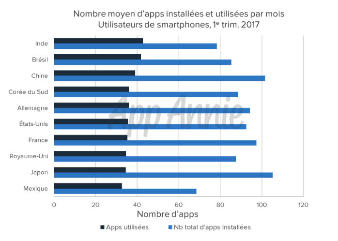 Même si le temps moyen par utilisateur varie de façon importante d’un pays à l’autre, il n’en a pas moins augmenté entre 2015 et 2017 dans chaque pays étudié, preuve de la présence grandissante des apps dans notre quotidien