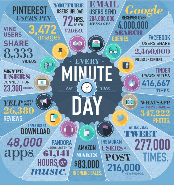 Chaque minute, 2,4 milliards d’internautes dans le monde génèrent un nombre incroyable de données. Tous les chiffres sur les Réseaux Sociaux, de Facebook à Vine en passant par Tinder, des transactions sur Amazon aux téléchargements d’applications Apple en une infographie.