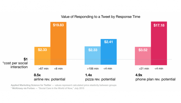 S’il est évident qu’il vaut mieux répondre que d’ignorer, encore faut-il le faire vite ! Twitter avance l’exemple d’une compagnie aérienne qui a répondu à un Tweet d’un client en moins de 6 minutes, le client était prêt alors à payer près de 20 $ de plus pour cette entreprise à l’avenir. De même, dans le secteur des télécommunications, les clients sont prêts à payer 17 $ de plus par mois s’ils reçoivent une réponse dans les 4 minutes. En revanche, ils ne sont prêts à payer que 3,52 $ de plus s’ils doivent attendre plus de 20 minutes.
